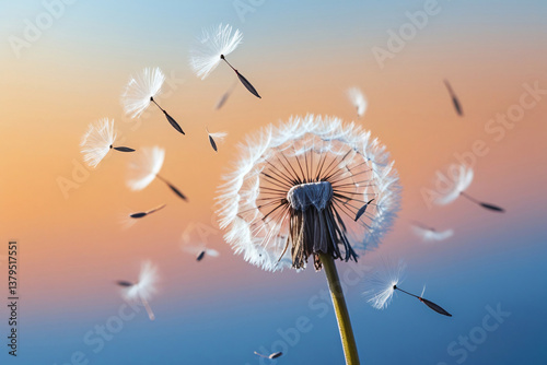 © Rattiya, Fototapeta premium A dandelion blowing in the wind against a blue sky.