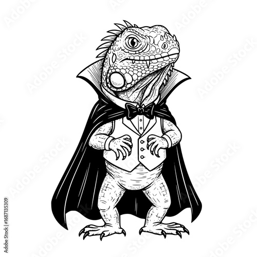 Fototapeta premium A dapper iguana in a tailored tuxedo and cape strikes a sophisticated pose, blending wildlife with elegance in a black-and-white illustration.