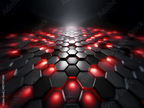 © YiuCheung, Obraz premium A dark, abstract background with a textured hexagonal pattern illuminated by red lights.