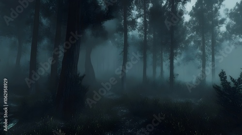 Fototapeta premium A dark and misty forest path shrouded in fog.