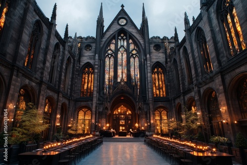© Sanchai, Fototapeta premium A dark and moody jazz performance in a gothic cathedral, with stained glass windows casting eerie, colorful light