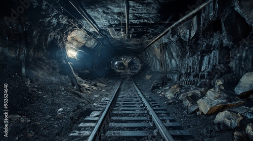 Naklejka premium A dark and narrow mine tunnel with a single track running through the center.