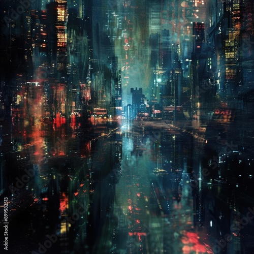 © Nam Sara, Fototapeta premium A dark and rainy cityscape at night