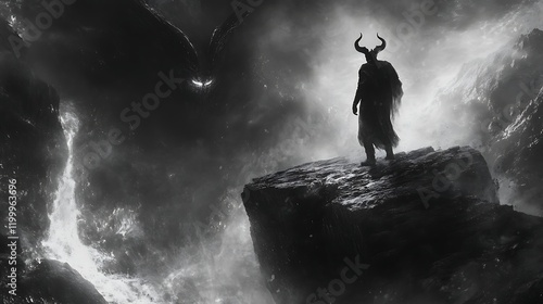 Obraz premium A dark and twisted devil figure with sharp horns standing on a rocky platform...