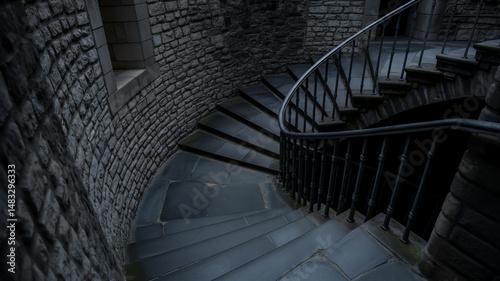 © Arif photos, Obraz premium A dark, atmospheric photograph of a curved stone staircase in a medieval castle