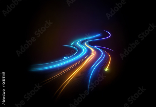 Obraz premium A dark background with a neon blue and orange light trail that swoops,...