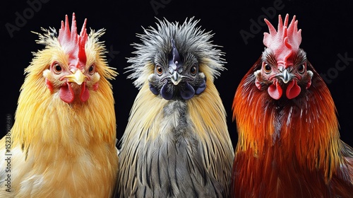 © MKS, Naklejka premium A dark black background provides the setting for a close-up photograph of three chickens, each with distinctive and colorful features and lively facial expressions