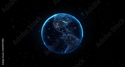 Obraz premium A dark blue background with the Earth in focus, surrounded by glowing...
