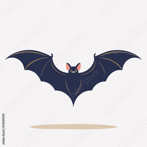 © Ela, Naklejka premium A dark blue bat with pink ears flying with its wings fully extended.