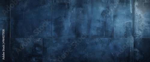 © Nipon, Fototapeta premium a dark blue, textured wall with a grid-like pattern of vertical lines.