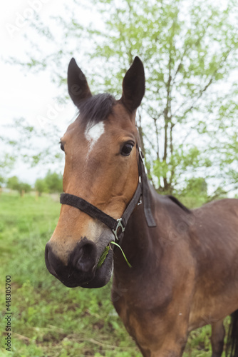 © CameraCraft, Obraz premium A dark brown horse in the field meadows munching on grass. Close-up view of horse head chewing grass. Concept of a horse grazing in the field meadows. High-quality daytime shot.