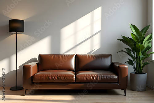 Fototapeta premium A dark brown leather sofa, next to it is a tall lamp, and on the other side...