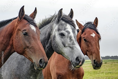 © gisstore, Obraz premium A dark brown stallion stood proudly in a green pasture. His black mane and tail fluttered in the wind, adding to his powerful and energetic image.