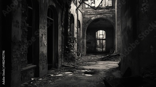 Fototapeta premium A dark, eerie abandoned building in grayscale