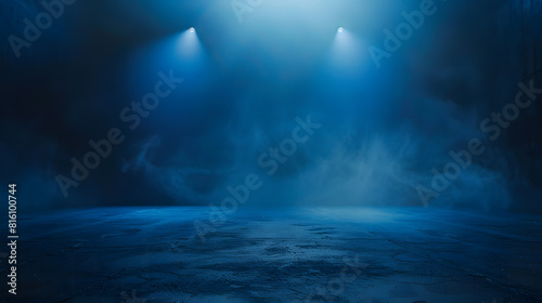 Naklejka premium A dark empty street dark blue background an empty dark scene neon light spotlights The asphalt floor and studio room with smoke float up the interior texture night view : Generative AI