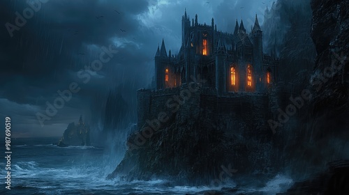 Fototapeta premium A dark, enchanted castle with glowing windows, sitting atop a cliff overlooking a vast, stormy sea.