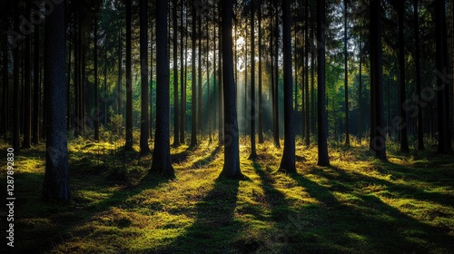 Fototapeta premium A dark evergreen forest with tall trees casting long shadows on the forest...