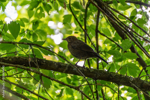 © Jakob, Fototapeta premium A dark-feathered blackbird perches on a branch amidst dense green leaves. The light filters gently through the canopy, creating a tranquil, natural atmosphere.