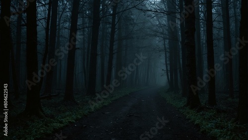 Fototapeta premium A dark, foggy forest path lined with tall trees.