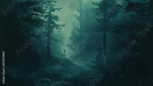 Fototapeta premium A dark, foggy forest with shadows lurking between the trees, creating a sense...