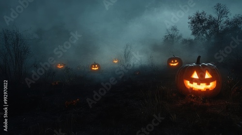 © P.G, Naklejka premium A dark, foggy Halloween night with pumpkins in the foreground, glowing eerily. Blank space for text on the right side. No logo.