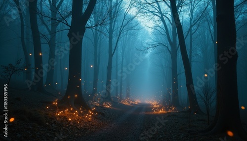 © Mr.Pancho Store, Fototapeta premium A dark forest at night with a path leading into the distance, surrounded by glowing orbs of light