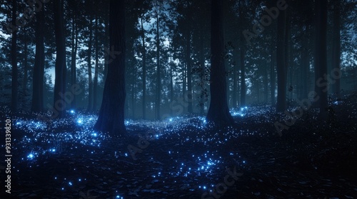 © Pic, Fototapeta premium A dark forest at night with glowing blue fireflies on the ground.