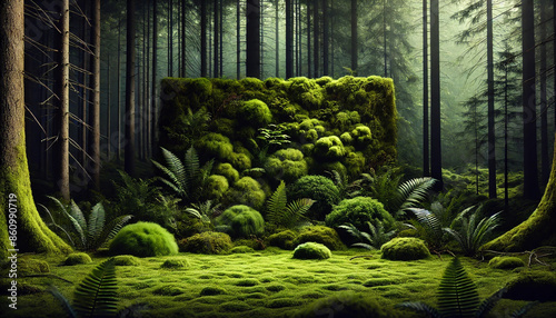 Fototapeta premium A dark forest background featuring green moss, designed as a backdrop for displaying products.