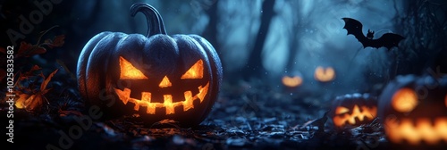 Fototapeta premium A dark forest hosts a collection of carved jack-o-lantern pumpkins, accompanied by a pumpkin and bat on the forest floor