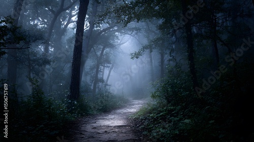 © hhh, Obraz premium A dark forest path shrouded in mist, where mystery lingers in the soft light.