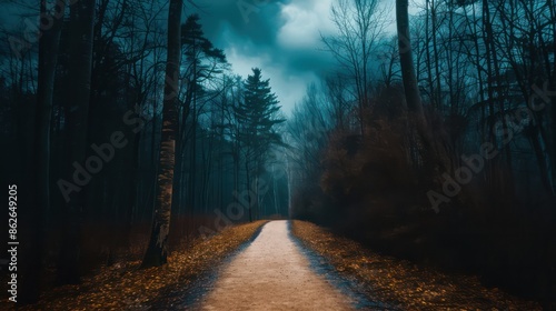 © Dumrongkait, Fototapeta premium A dark forest road with trees on either side. The sky is cloudy and the trees are bare