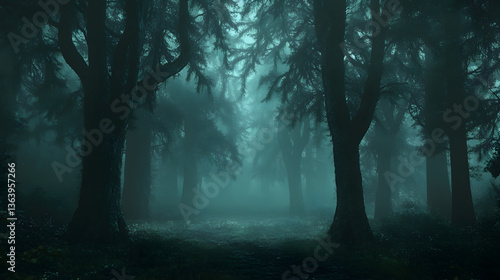 Fototapeta premium A dark forest shrouded in mist, rumored to be haunted by lost souls.