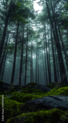 Obraz premium a dark forest with tall trees and mossy rocks,