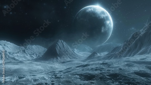 Fototapeta premium A dark futuristic alien landscape with rugged mountains under a night sky, with a large satellite in the sky.