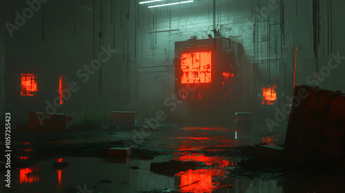 © Putu, Obraz premium A dark, futuristic scene with red glowing panels and a flooded floor.