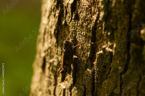 © JakaSuryanta, Obraz premium A dark gray grasshopper camouflages the tree bark, in shallow focus.