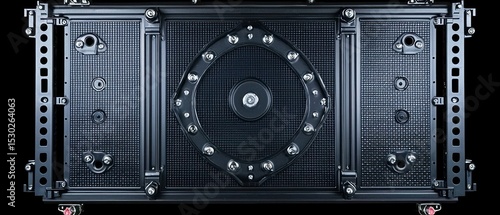 © sxr, Fototapeta premium A dark gray rectangular device with a central circular component, surrounded by smaller components and attachments. It features a textured surface and numerous fasteners