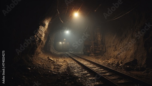 Naklejka premium A dark, gritty tunnel with tracks, illuminated by overhead lights, hinting at mining