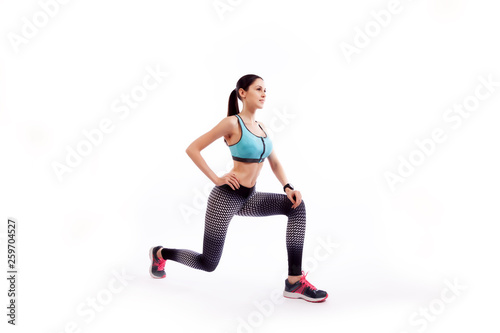 © Виталий Сова, Fototapeta premium A dark-haired woman coach in a sporty short top and gym leggings makes lunges by the feet forward, hands are held out to the side on a white isolated background in studio