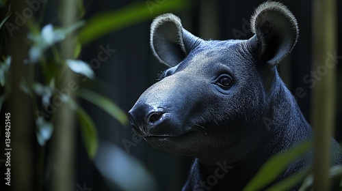 Fototapeta premium A dark-hued tapir, its large ears and expressive eyes visible amidst lush...