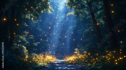 Naklejka premium A dark, mysterious forest scene illuminated by moonlight or the glow of fireflies, evoking a sense of wonder and intrigue