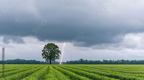 © Preecha, Naklejka premium A dark, ominous cloud formation with a single bolt of lightning striking a lone tree in a field.