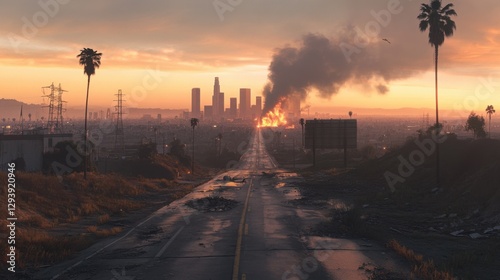© Алена Ваторина, Fototapeta premium A dark, ominous road leads to a distant city skyline with smoke rising into the sky under a dramatic sunset, evoking a dystopian atmosphere