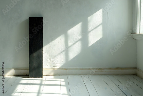Obraz premium A dark rectangular object standing in a white room with sunlight streaming...
