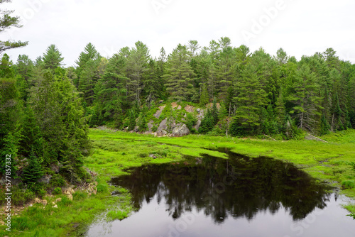 © Gregory, Fototapeta premium A dark, reflective pool of water sits amidst vibrant green marshland, backed by a rocky, evergreen forest under an overcast sky