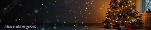 © chaiwat, Fototapeta premium A dark room filled with gold lights and decorations on a Christmas tree in the corner, with a few snowflakes falling from the ceiling, gold lights, festive atmosphere, dark room