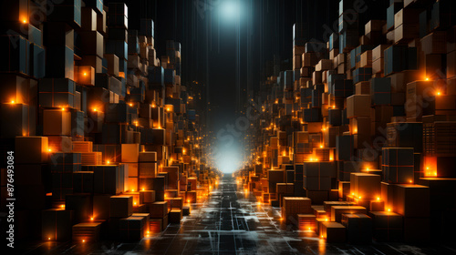 Fototapeta premium A dark room with many boxes and a path of light