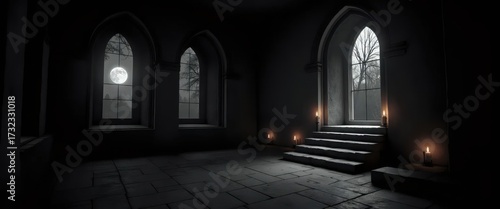 © Background Shop, Fototapeta premium A dark room with three windows and a set of stairs.