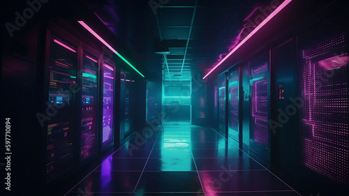 Fototapeta premium A dark server room with pink and light blue lighting elements, AI generated design