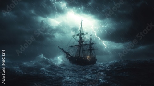 Fototapeta premium A dark ship sails through wild waves under a stormy sky with flashes of lightning illuminating the scene.